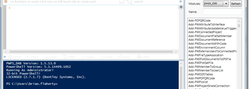 Over the course of the next weeks, months and years, I will be posting articles, scripts, functions, etc. to help with the administration of ProjectWise. Feel free to contact me with any comments, questions, requests, etc.